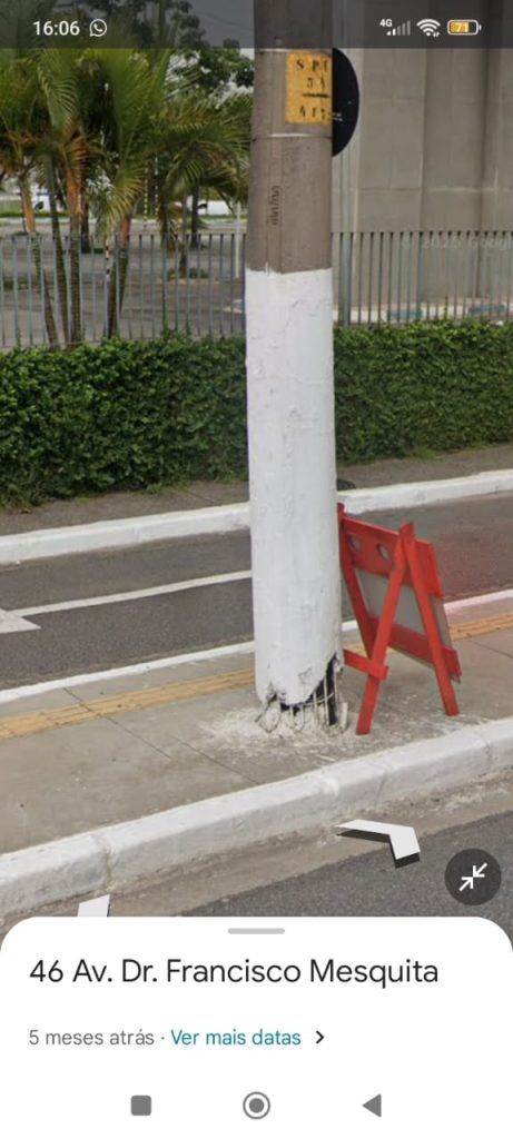 15/06/2025 – Um poste danificado esta preocupando motoristas e pedestres que passam próximo ao Central Plaza shopping, o poste esta com a ferragem a vista, sinalizado com um cavalete aguardando a troca.